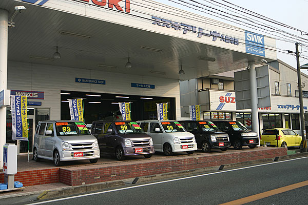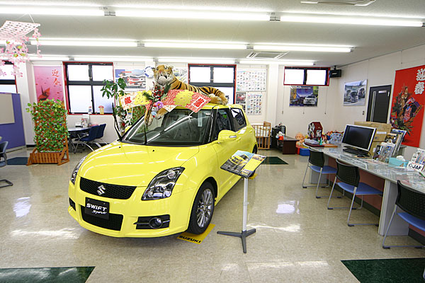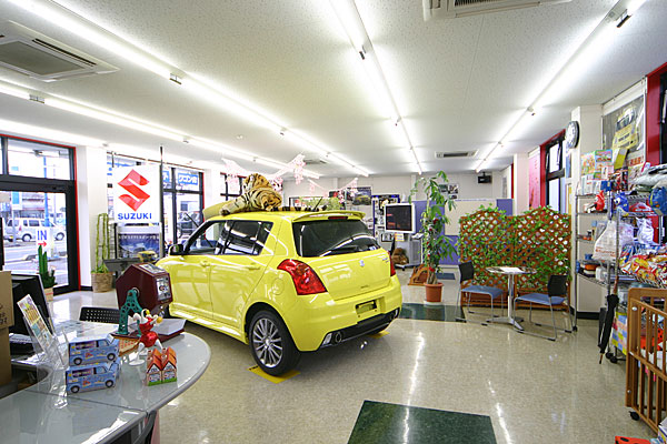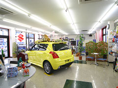 | 社屋左側が中古車コーナー、右側が新車ショールームです。 常時スイフト、スイフトスポーツ、SX-4、エスクードの試乗車をご用意しています。 |
